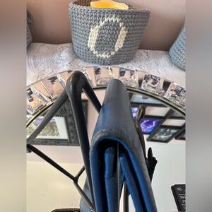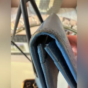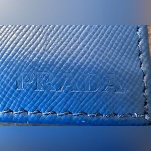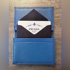 Prada Cobalt Blue Vertical Saffiano Logo Embossed Fold Wallet with COA. Good condition with some corner wear pictured.