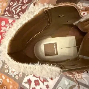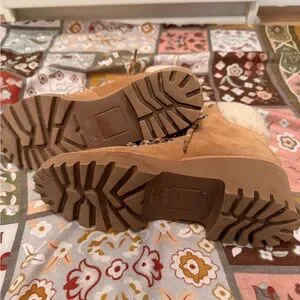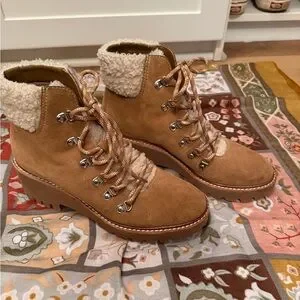 Stylish lace-up boots by Dolce Vita. Features tan suede with cream detailing. Perfect for casual wear.