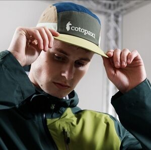 Stylish Cotopaxi cap with blue, green, brown, and tan panels. Perfect for outdoor adventures.