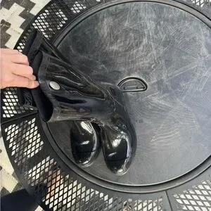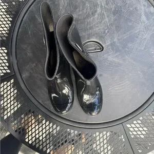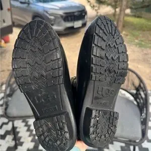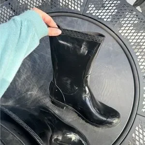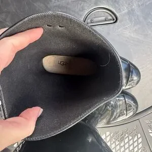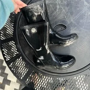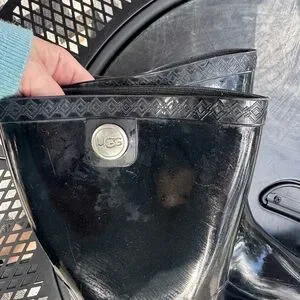 Glossy black rain boots by UGG. Stylish and waterproof. Ideal for wet weather.