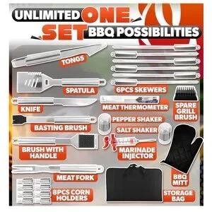 Complete BBQ grill tool set with stainless steel utensils. Includes a black quilted glove and a sleek black case.