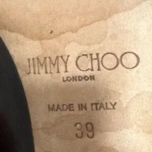 Chic black leather heels with strappy design. Signature Jimmy Choo elegance.