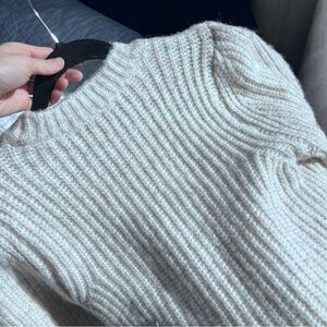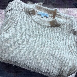 Elegant Heathered oatmeal colored sweater with a classic crew neck. Soft knit for comfort and style. Lighting in my apt makes it look gray but it’s a cream oatmeal color. Slightly shorter length so it hits right at the waist. Very flattering and a small puff at sleeves to give it body
