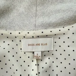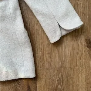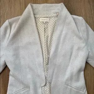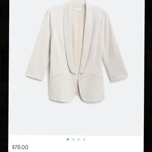 Worn once. This is a relaxed blazer. Sort of a mix between blazer and cardigan. Very soft, not stiff. Color is a very light oatmeal. Sleeves are 3/4 length and the pockets on front are fake 🧐