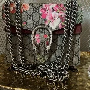 Stylish Gucci crossbody with floral print. Features iconic GG canvas and silver chain. Perfect for day or night.