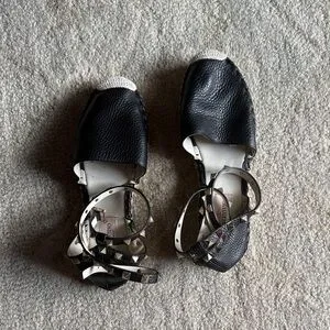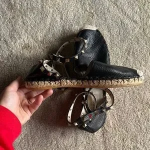 Chic black leather espadrilles with cream accents. Stylish ankle straps. Perfect for casual elegance.