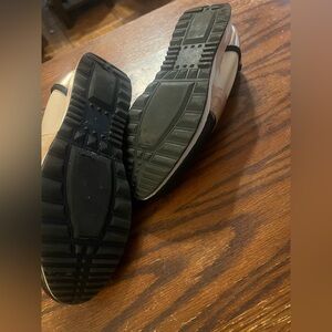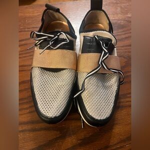 Modern sneakers with a black and tan design. Features breathable mesh and stylish laces. Ideal for casual wear.