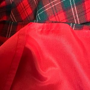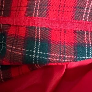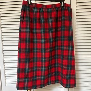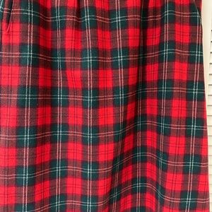 Gorgeous authentic Lennox Tartan 100% virgin wool Pendleton midi skirt. A classic plaid for Christmas holiday cheer - dark red, dark green, and white. Fully lined with red satin. Excellent condition. I can tell it has been altered by the original owner. The waist has been expanded with a well-tailored segment of fabric on the right side (while wearing) and the button on the left side (while wearing) has been moved over to allow for a more generous fit.