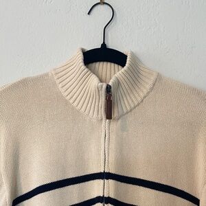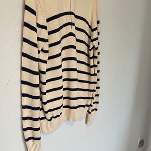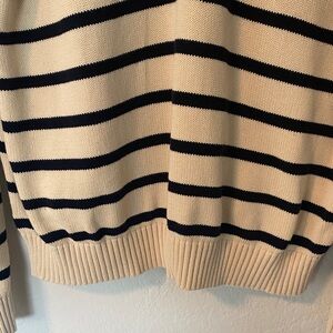 Chic cream oversize sweater with black stripes. Features a convenient 1/4 zip-up design. Ideal for casual wear.