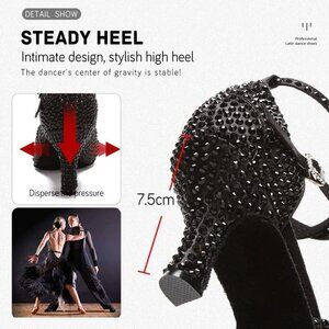 Features: Elegant satin dance shoes with sparkling rhinestones and a comfortable suede sole. The heels are 2.3 to 3.3 inches high, perfect for Latin, Salsa, Rumba, and more. The anti-slip suede sole offers great grip and balance, lightweight and durable for intense dancing.