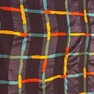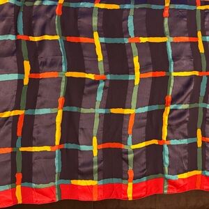 Vibrant silk scarf with a geometric pattern. Features red, orange, blue, and yellow colors.