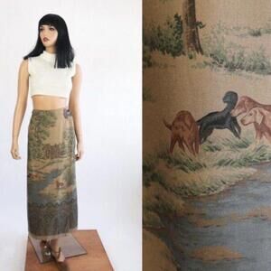 This vintage skirt from Lauren Ralph Lauren features a scenic print of River Labrador Retrievers, perfect for dog lovers. The wrap style and midi length make it a flattering piece for any woman. The brown color adds a touch of elegance while the regular size type ensures a comfortable fit. Ideal for any occasion, this skirt is a must-have for any fashion-forward woman. No flaws.