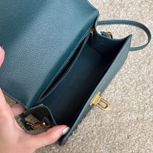 Sophisticated mini bag in teal. Features elegant gold hardware. Perfect for day or night.