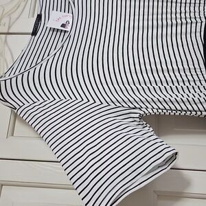 Chic midi dress with black and white stripes. Suoer soft fabric and relaxed fit. Ideal for casual outings.
