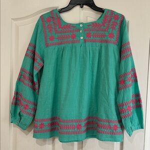 J.MARIE Embroidered Long Sleeve Top Sz S Teal Green & Pink Cotton
