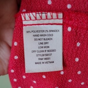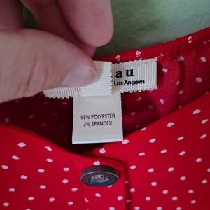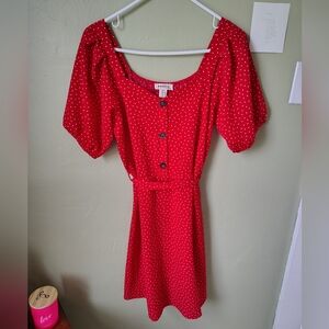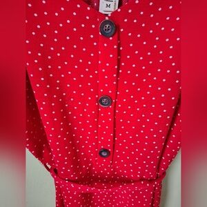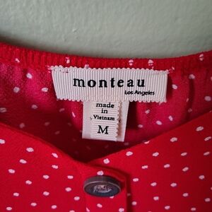 Monteau Los Angeles women's medium red with white polka dots puff sleeve midi dress with faux buttons and cloth belt to tie at the waist. Dress is in excellent condition. Super cute, just doesn't fit my body shape as I had imagined. Pullover style.