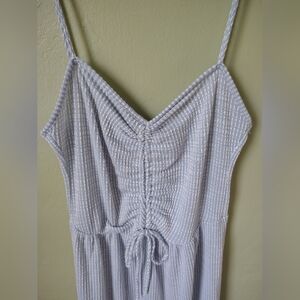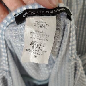 Caution to the Wind women's medium light blue and white spaghetti strap dress with cinched bodice that can be adjusted for better fit. Purchased brand new with tags and worn twice. It just doesn't fit my body type as I thought it would, so re-selling. Excellent condition and super cute.
