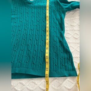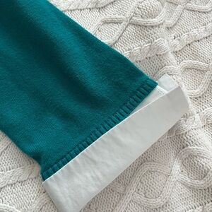 EUC excellent condition & quality! Elegant teal V-neck sweater with crisp white accents. Ideal for a polished look. Measurements in photos. Smoke free home. Cotton, polyester & spandex blend. Women’s size medium