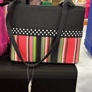This elegant women's shoulder bag features a vibrant striped design in black, pink, and brown, complemented by a charming polka dot bow. Perfect for adding a stylish touch to any ensemble.