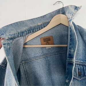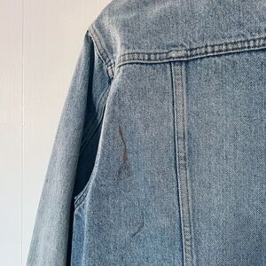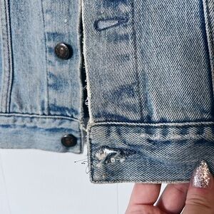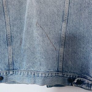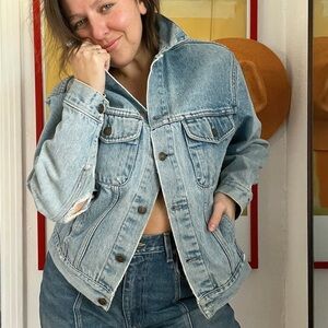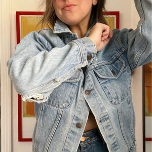 Amazing vintage denim jacket. Distressing throughout, holes in the elbows, the larger one on the right elbow. Distressing at wrists and collar as well as along the button edge. I believe it’s a men’s medium, I love the oversized look, but I’m happy to provide measurements upon request.