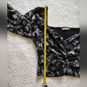 Recently purchased item. Super cute in excellent condition, just was a little too cropped for my liking, so re-selling. Ruched front bodice and smocked back for a more flattering fit. Sheer long bell sleeves cinched at the ends. Sweetheart neckline and square back. No rips, tears, or stains.