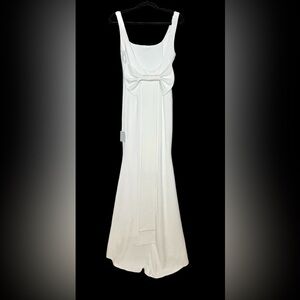 The sleek masterpiece that is this crepe knit bridal gown will have everyone swooning as you walk down the aisle. The sleeveless bodice features wide straps and a backless design, all atop a figure-flaunting, mermaid maxi skirt with a fitted waist and a subtle train. An oversized bow at the back perfectly completes the look, just how you envisioned it. Hidden back zipper/clasp.’