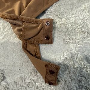 Chic tan bodysuit with a deep V-neck. Long sleeves for a sleek look. Perfect for layering or standalone style.