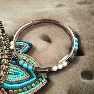 Handmade seed bead boho tribal bib necklace in turquoise and brass colored beads and chain.