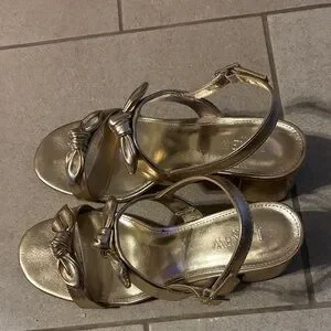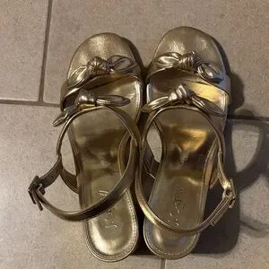 Chic metallic gold sandals with stylish knot detail. Ideal for adding a touch of elegance.