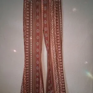 Stylish bohemian patterned flare pants with a mix of earthy tones. Perfect for a casual or festival look.