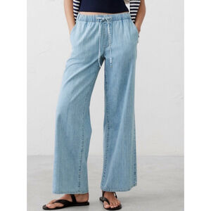These are pre-owned Banana Republic women's wide-leg, mid-rise pants in a light blue wash in a size small. The pants feature an elasticated waistband with an adjustable drawstring tie. They have two front pockets and two patch pockets on the back. The fabric is a lightweight denim perfect for summer, only showing some creasing from storage. Comes from a smoke free home!