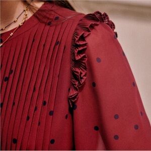 Sezane Eve Dress Plum Navy Blue Polka Dots Pleated Ruffles Long Sleeve 34 US 2