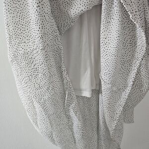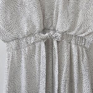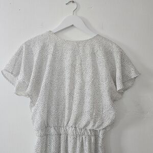Elegant white maxi dress with a flattering V-neck. Features a cinched waist, pockets, flutter sleeves, and flowing skirt. Fully lined. Perfect for any occasion.