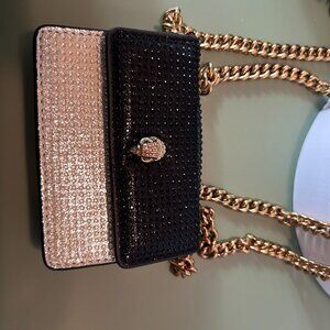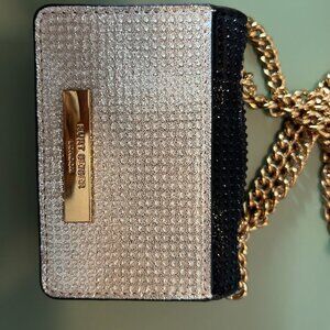 The Micro Kensington Purse features a black and silver exterior with crystal embellishment.
