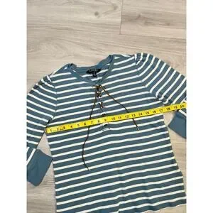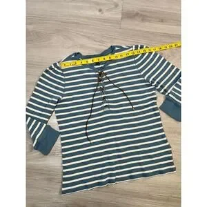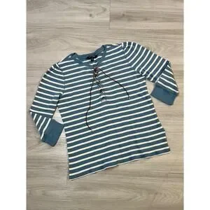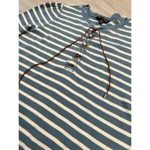 Lauren Ralph Lauren Women Top Striped Henley Long Sleeve Lace Up Blue White Sz L