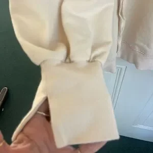 Soft cream cotton fabric. Delicate pink yellow stitching detail.