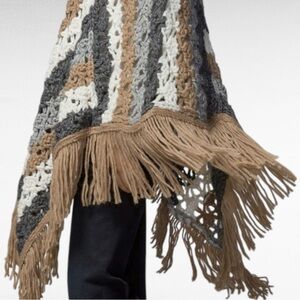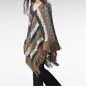 Massimo Dutti | Crochet Striped Poncho Alpaca Wool Blend Fringed Cozy Poncho