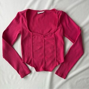 Stylish fuchsia crop top with ribbed texture. Sweetheart neckline. Corset look in front (but not actually a corset). Inside tag says size 10, neckline tag says size 4, I’m 99% sure it’s a 4. Looks really small but it’s very stretchy.
