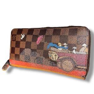 Louis Vuitton Damier Ebene Animation Christmas 2015 Evasion Zippy Wallet. This is a limited edition piece from the brand's 2015 Christmas collection, featuring an animated 1920s-style car scene printed over the signature Damier Ebene coated canvas.