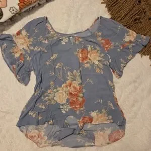 Charming blue blouse with floral design. Features short sleeves and a relaxed fit. Ideal for casual outings.