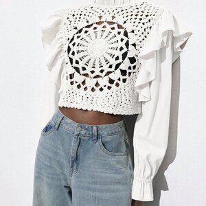 White Casual Women's Apricot Hollow Hook Flower Splicing Ruffles Tops