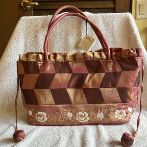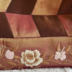 Handmade Natural Taffeta Silk purse with white, light brown, and pink embroidered flowers and butterflies.