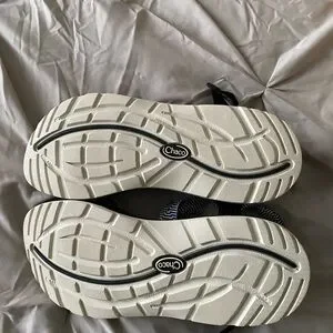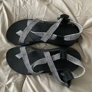 Chaco sandals with striking zebra-patterned straps. Ideal for outdoor wear.