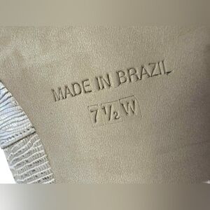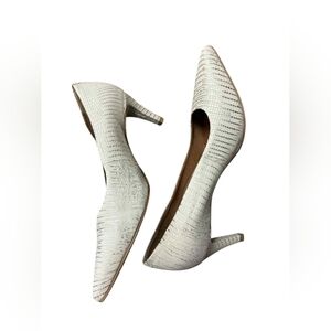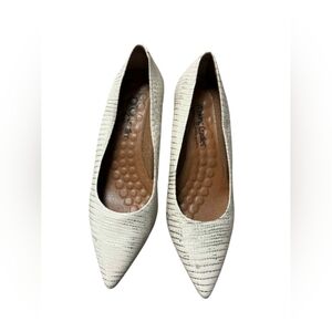 Walking Cradles Pointed Closed Toe Heels. Beige with metallic gold reptile print design. Signature Tiny Pillows® sole for ultimate comfort. Sole is removable. Comes in original box. Only slight swear. 2’ heel.