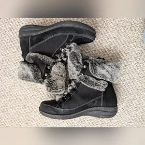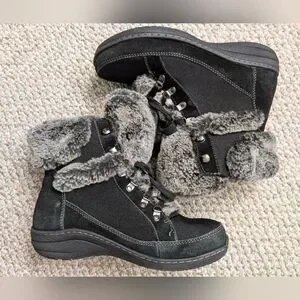 Women's Aetrex Fiona fur ankle boots. Features arch support, slip resistant soles, and waterproof exterior. Size 7.5-8. Like new condition.