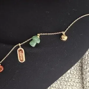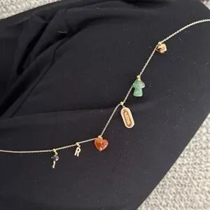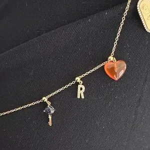 Elegant gold necklace featuring a charming heart, a jade mushroom, a beautiful onyx like key, a golden apple, etc Perfect for adding a touch of whimsy to any outfit. (All charms are removable and the necklace is adjustable)