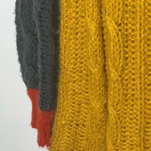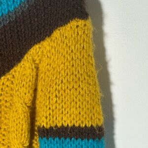 Embrace vibrant style with this colorful striped women's vintage sweater. Featuring bold shades of yellow, brown, blue, and red, this sweater adds a pop of color to any outfit. Perfect for staying cozy and stylish. There is no tag so it is hard to determine the age so see measurements below. Possibly homemade? There is some lint like coming from the yarn which you can see in the pictures. Let me know if you have any questions!