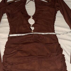 Chic chocolate brown dress with long sleeves. Features a unique cut-out design. Perfect for stylish outings.