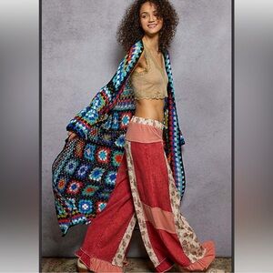 Vibrant crochet long cardigan with a black multicolor pattern. Perfect for adding a pop of color to any outfit.