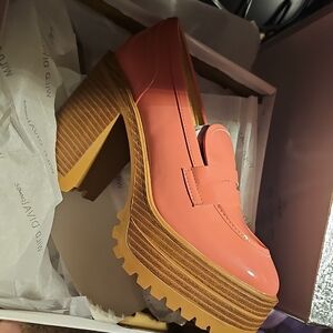 Elevate your look with these stylish coral platform loafers. Perfect for a bold fashion statement.